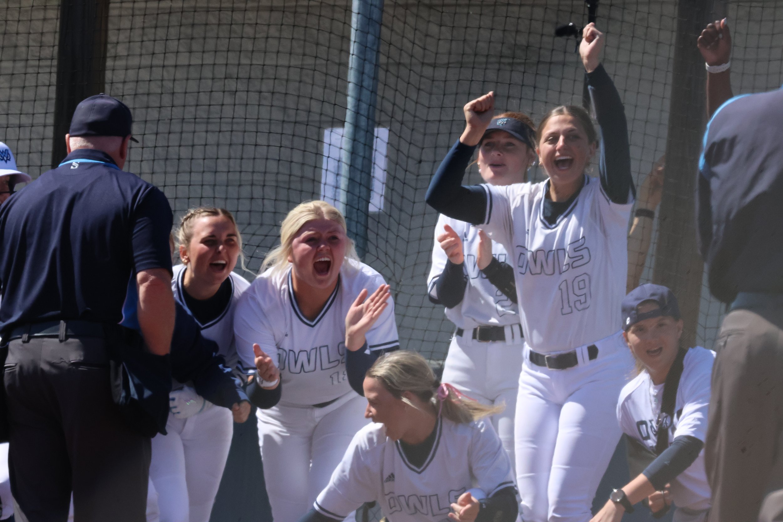 Owls softball players celebrate during a game versus Westminster.